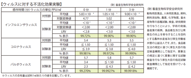 ■コロナウイルス(家畜衛生株)に対する不活化効果実験 0分99.981% 1分99.972% 3分99.990% ※2