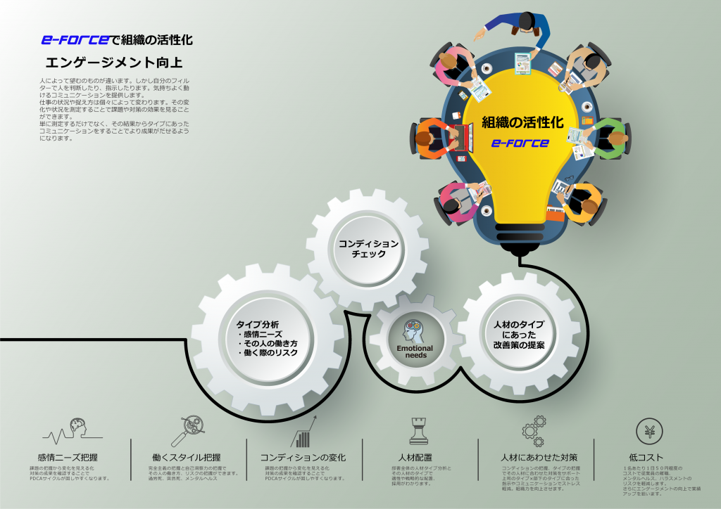 イーフォースは組織の状態を可視化し、人材の持つ個々の感情ニーズ(選択基準)を把握し、それぞれの人材に合った声がけ、指示を行い改善を実施していく事で、組織の成長を視覚化していくサービスです。