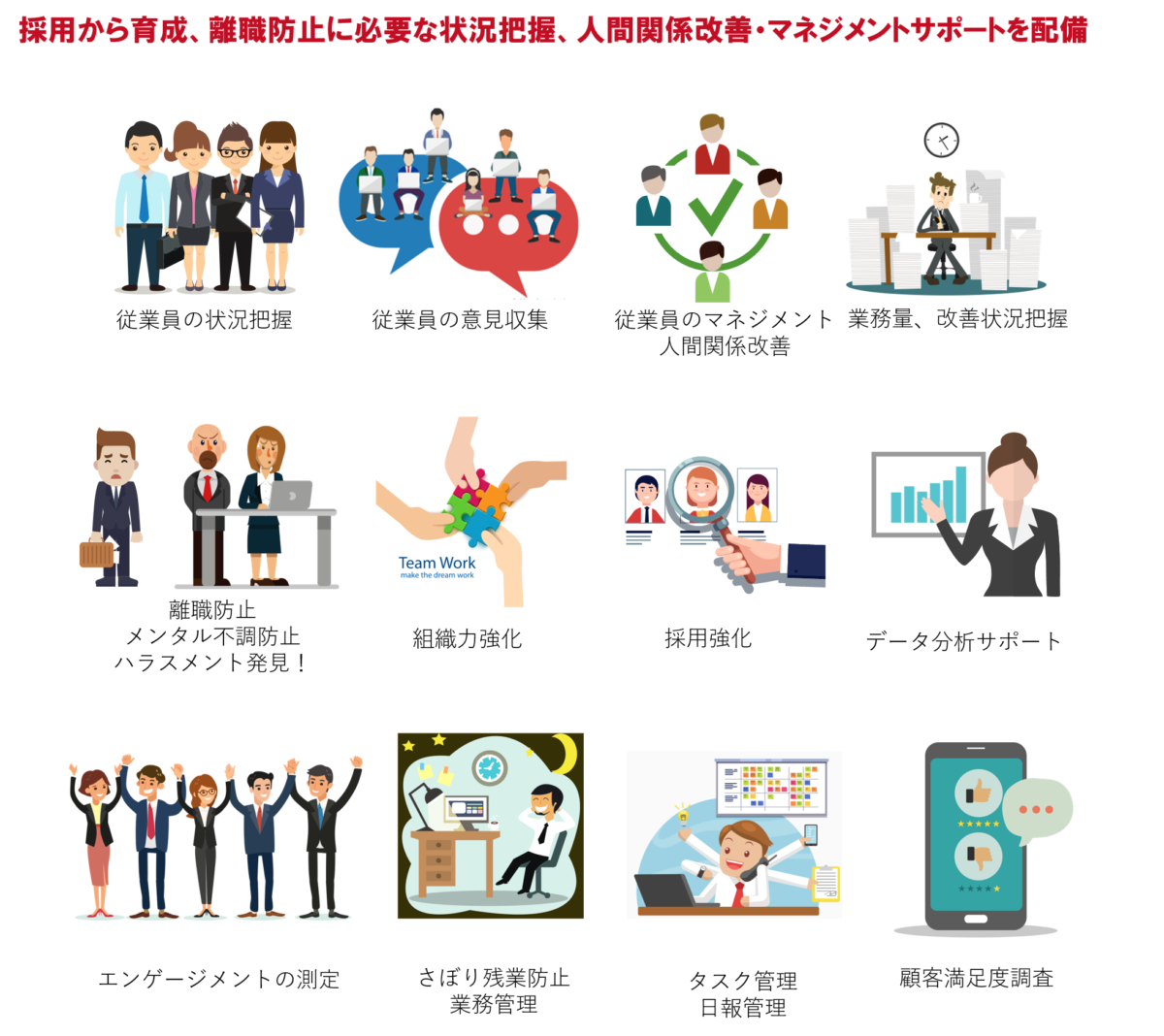 これは、1分間で社員のストレス状態やモチベーションを測定し、 異常を早期発見することができるシステムです。毎月、すべての社員に1分間でできる質問メールを送信し、 その回答によって、不満を抱えている部署や社員を発見、 即座に対応することが可能です。 |