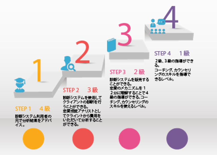恋愛成就アナリストは恋愛診断システムやクライントのお悩みからクライアントのタイプ、行動パターンを分析し、適切なアドバイスやカウンセリングを行うスキルを身につけます。