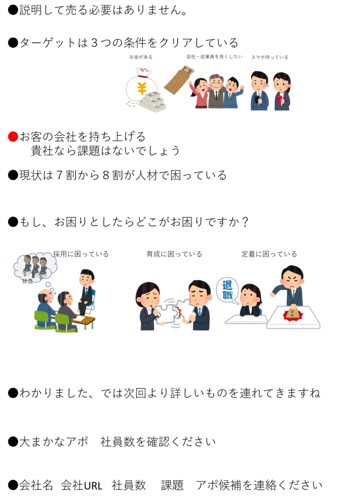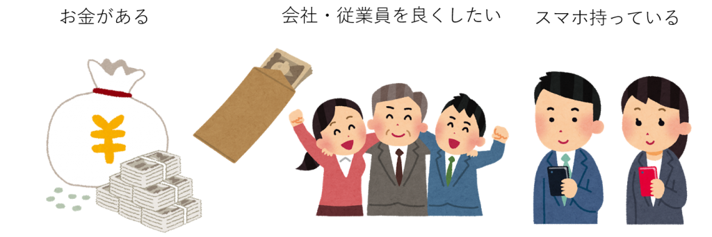 訪問先の条件は、①お金がある ②会社、従業員を良くしたいと思っている経営者 ③従業員がスマホをほとんど持っている という条件です。