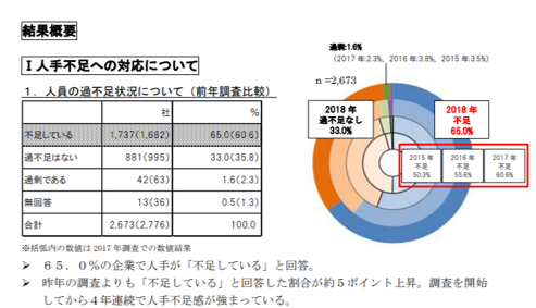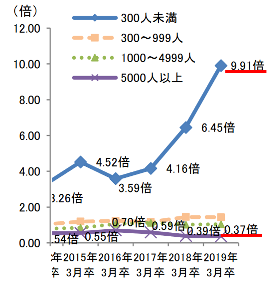 300人未満企業では9.91倍と、前年より+3.46ポイント上昇し、過去最高*2となった。一方、5,000人以上企業では0.37倍と過去最低*。従業員規模が小さい企業ほど採用が難しい状況が顕著。また、300人未満企業では、求人に対して41.6万人の人材不足。前年の36.0万人から不足数が大きく増加した。
