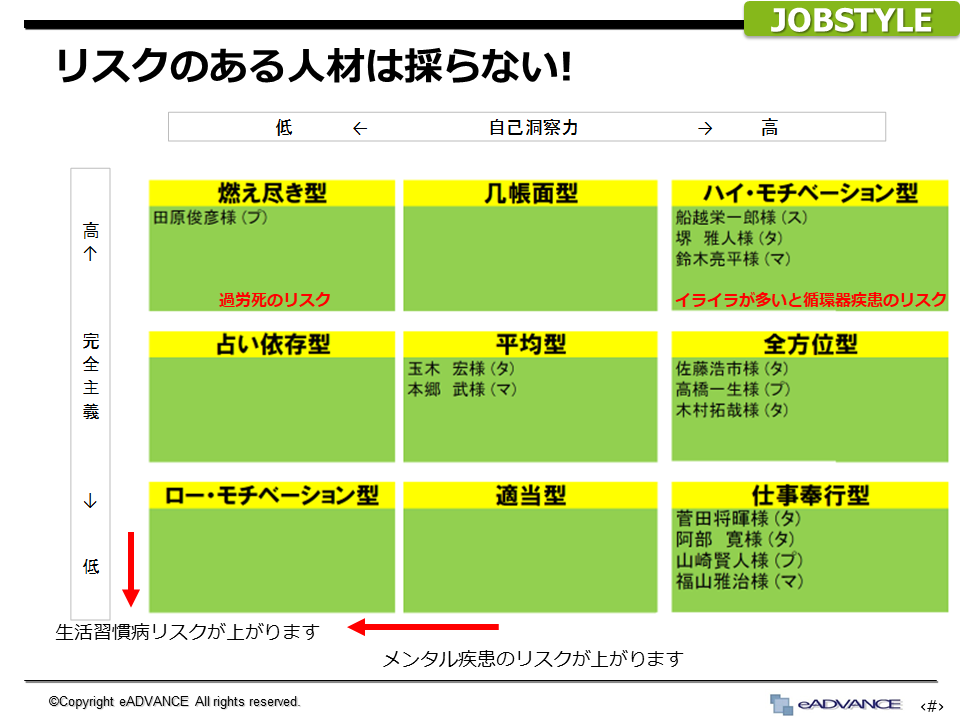 左側の立て3つ「燃え尽き」「占い依存」「ローモチ」はうつ病、睡眠障害のリスクが高いです。